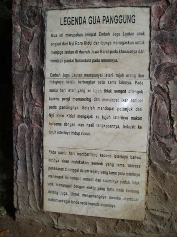 Goa alam lain adalah Goa Panggung, yang diyakini dihuni Embah Jaga Lautan atau disebut pula Kiai Pancing Benar. Beliau merupakan anak angkat dari Dewi Loro Kidul dan ibunya menugaskan untuk menjaga lautan di daerah Jabar dan menjaga pantai Indonesia pada umumnya.